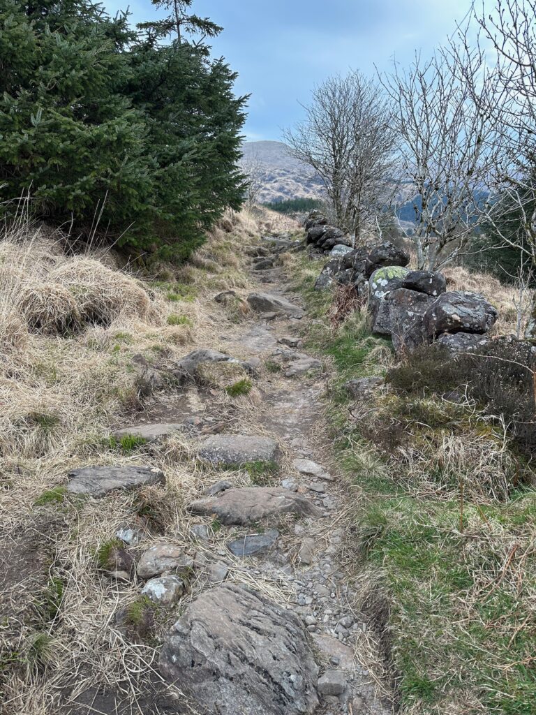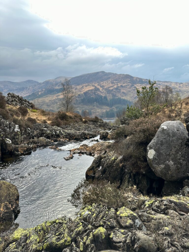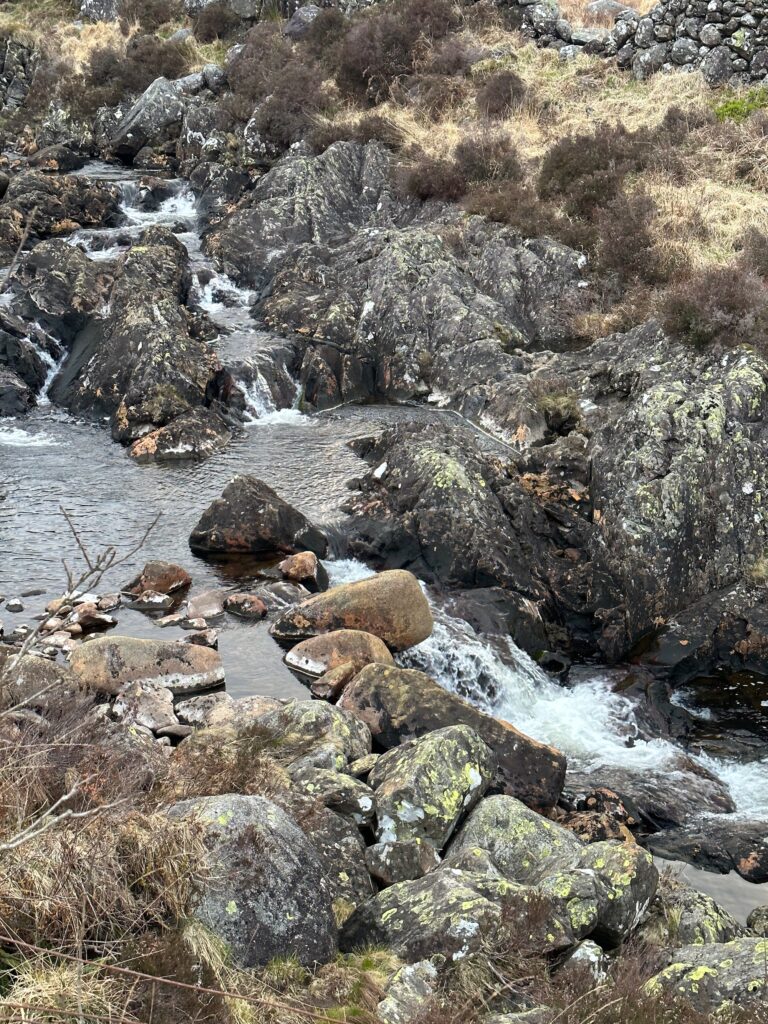 This hike starts from Bruce’s Stone. A rocky path follows the stream flowing between the higher lochs and down into Loch Trool.