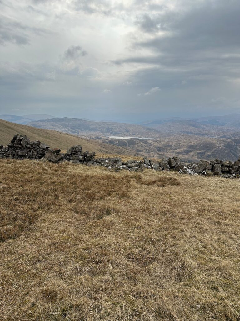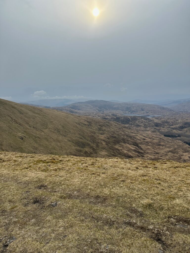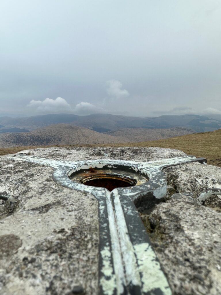 So then I hit my first Scottish mountain, greeted with a trig point and the sun really was trying to get through that cloud. Although this summit isn’t a Munro, its not quite tall enough at 2,766 ft that does place it in Corbett territory though.