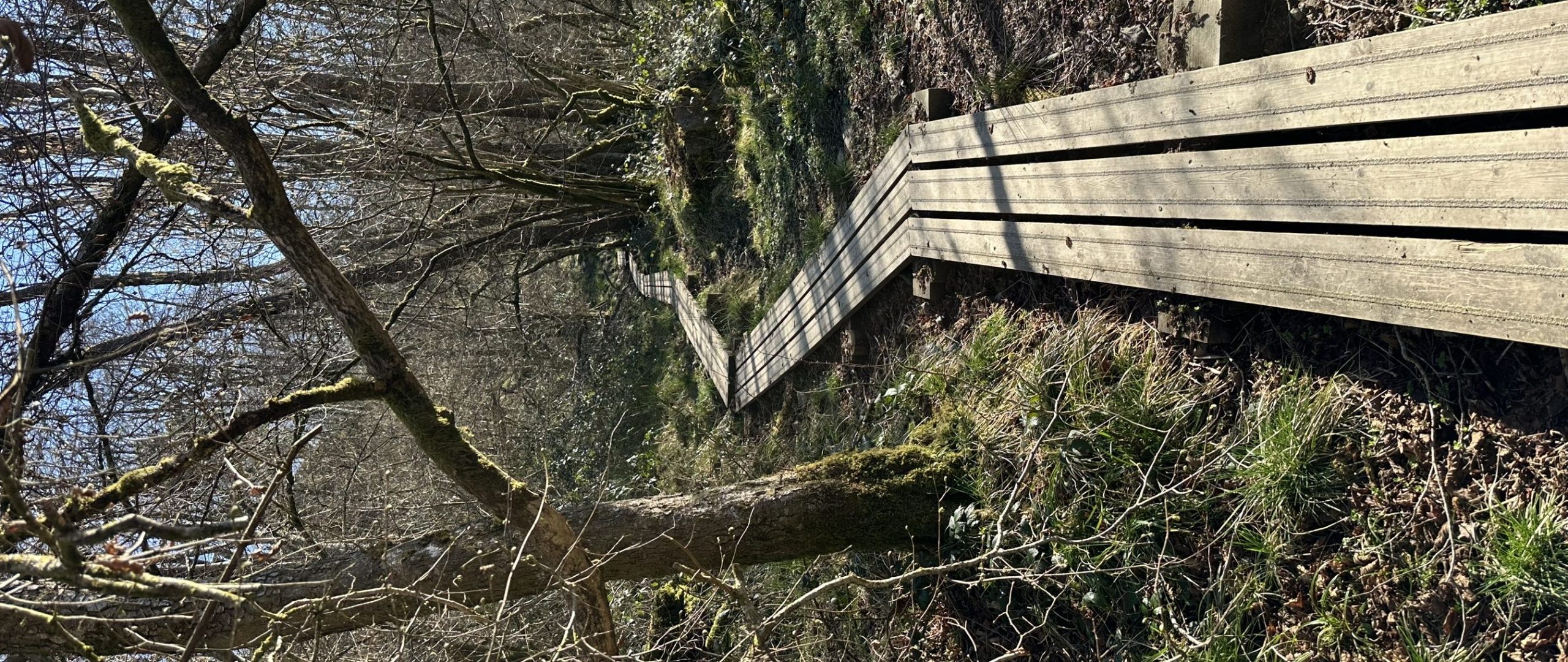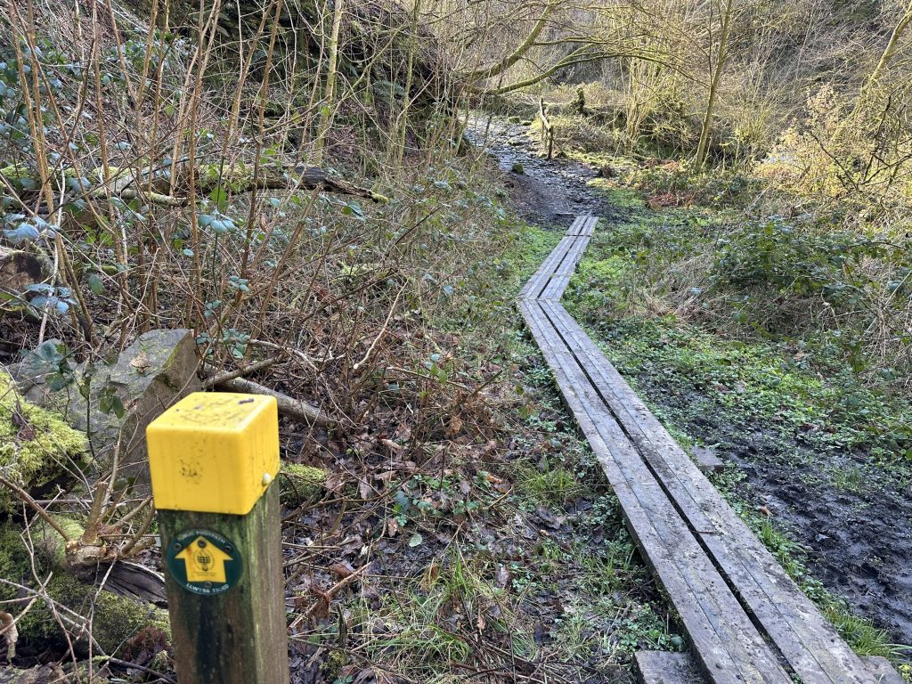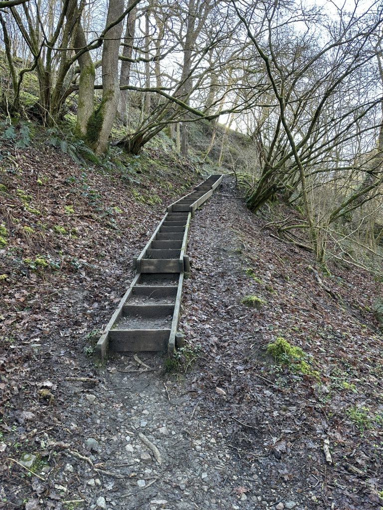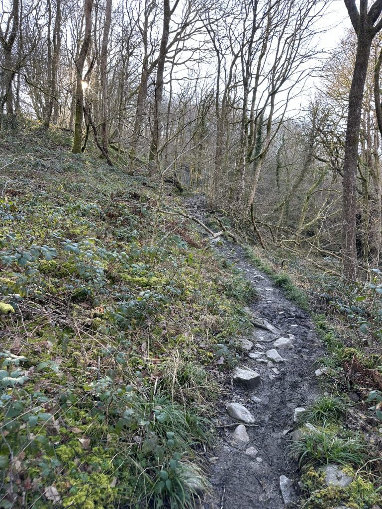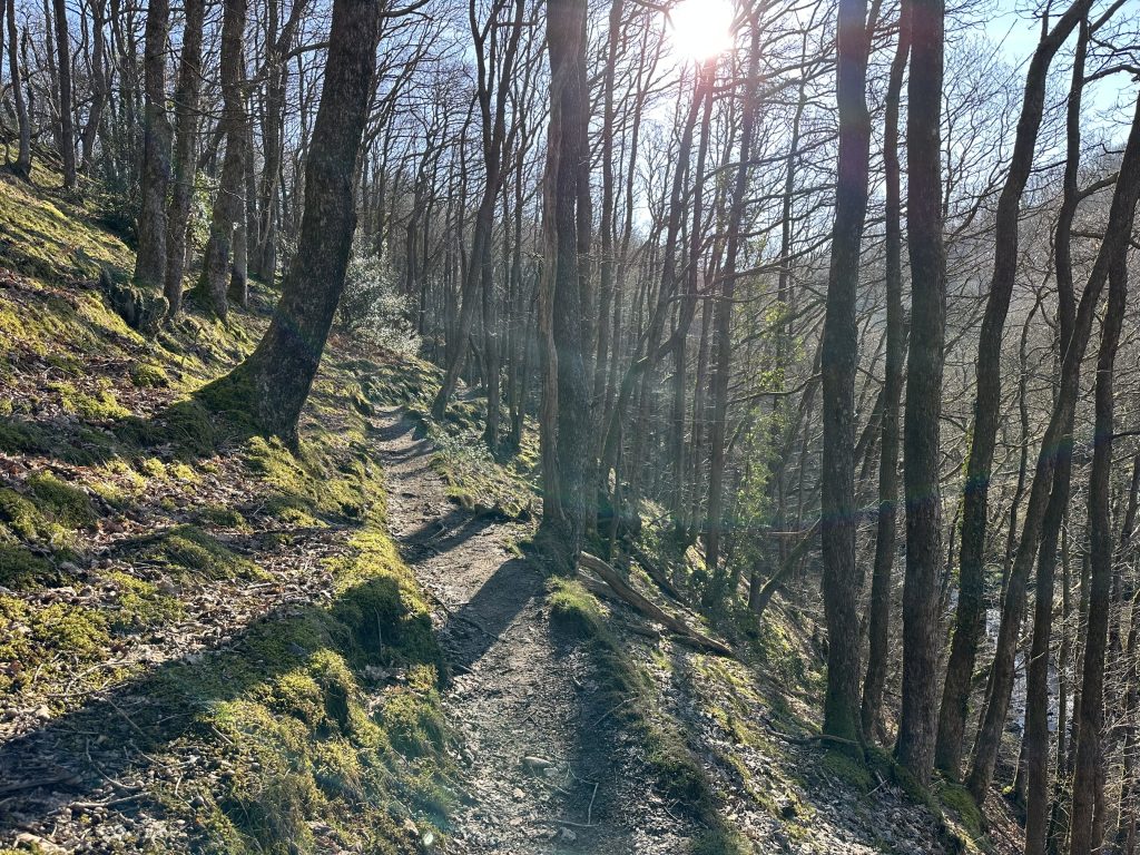The path isn’t technical but as you climb higher the river below does quickly start to feel further away. Sure footing is needed, as the ground by the path steeply slopes away. There are trees adorning the sides of the trail some of the ancient woodland. I must admit it doesn’t look amazingly suitable for support if you slip.