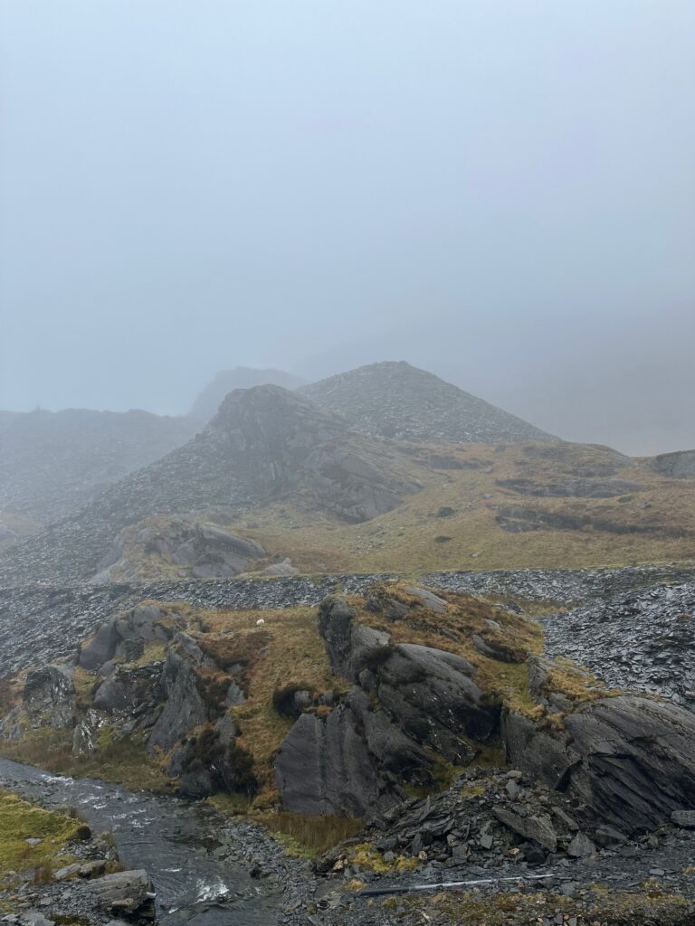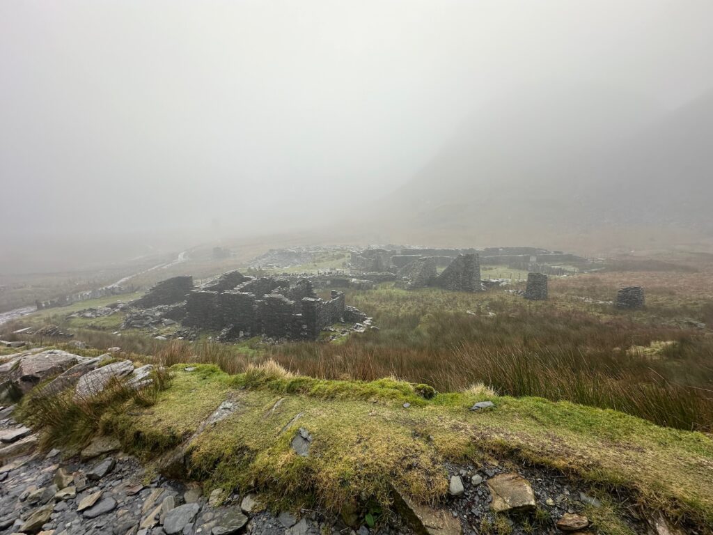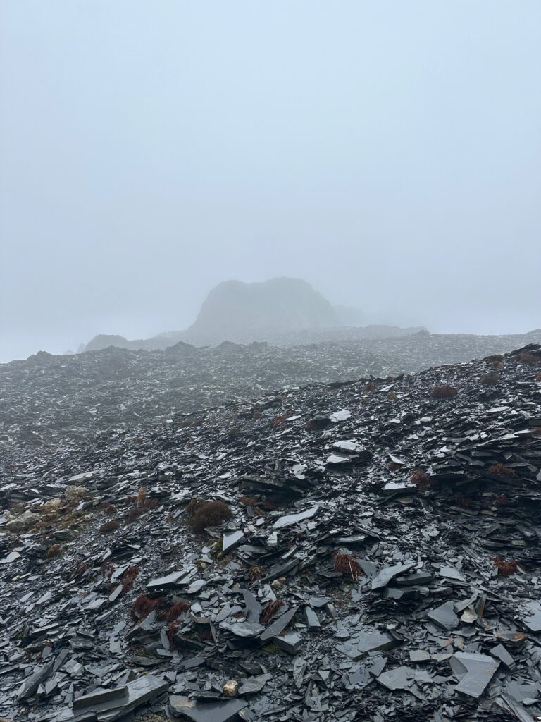I headed up from the mining village, well to another one. I was following a bridle path although it was almost entirely slate, and wet. It wasn’t the easiest thing to hike up with tired legs. I knew that if I strayed from the path on this plateau between summits I could quite quickly find myself in some boggy situations. A few areas of marsh land were dotted about and they are not always the easiest to navigate at the best of time yet alone in poor visibility