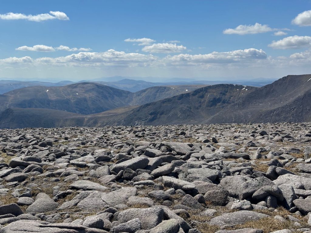 Unlike the summit of some mountains, the top of Ben Macdui is a very large flat area, spotted with lots of boulders. There are plenty of little wind shelters and they do almost appear hidden but it means that even with a crowded summit it still feels like you have it to you self. It also means that you have options for escaping the wind now matter which direction it is heading from.