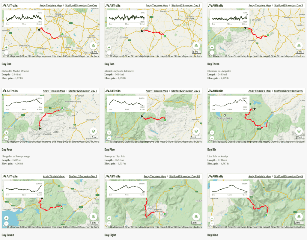 The longest days are the flattest, with day one and day six both coming up close to the 30 mile mark. This is contrasting with the “shorter” mountain days, with a very short day eight crossing over the Glyderau range.