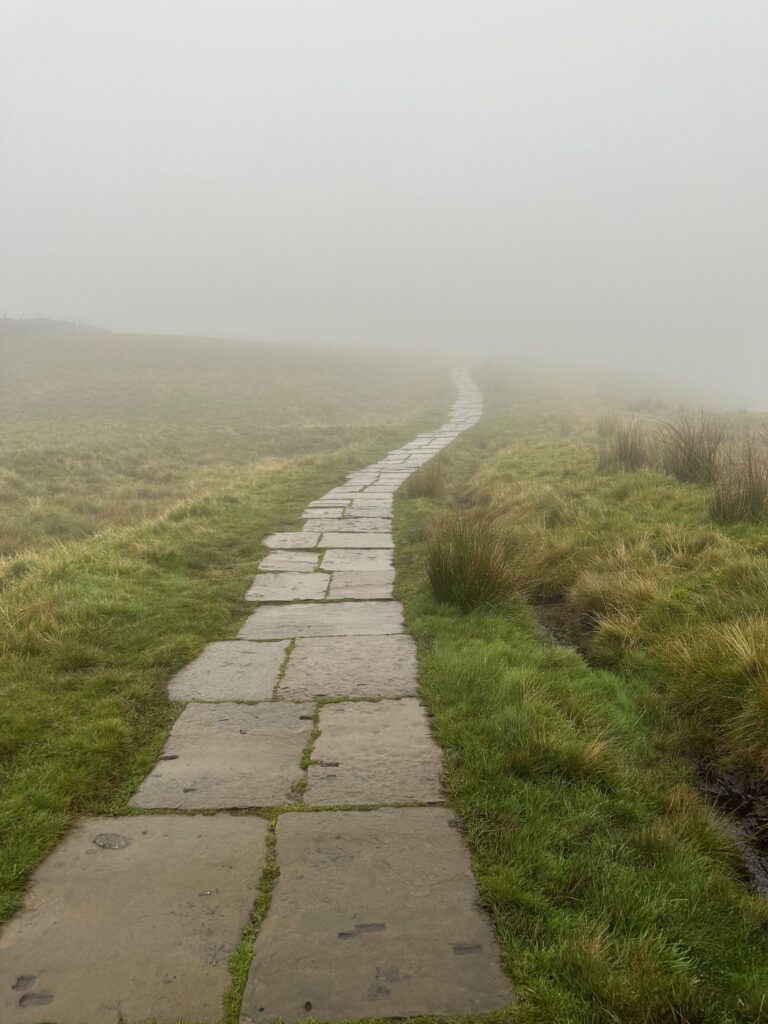 The ascent up to Whernside, appearred to last even longer due the clouds setting in. Visibility was not great, there was a lot of mist and fog, but I was grateful of this as the higher you get up the dirt and stone trail, the closer to edge you get and the steeper it looks. I would also say that the path might be on the wrong side of the wall. The mystery drop to the left though does make the whole xperience feel a little more like some of my most recent hikes.